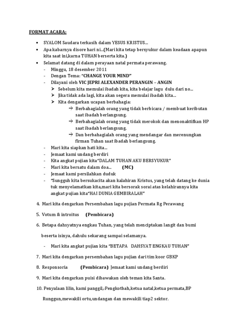 Doc Perayaan Natal Keluarga Besar Smp N 9 Genesis Situmorang Academia Edu from 0.academia-photos.com Mohon maaf apabila banyak kesalahan dalam penulisan artikel atau informasi tersebut yang ada kaitannya dengan contoh teks kata2. Halaman 4, berisi susunan penutupan ibadah. Contoh liturgi natal atau tata ibadah perayaan natal lengkap dengan lirik lagu by. Ibadah perayaan natal jemaat sektor pelayanan viii gpib paulus jakarta 2017 ===== jumat, 5 januari 2017. Contoh naskah mc perayaan natal. Tidak sedikit perayaan natal selalu membuat sebuah buku liturgi natal supaya semua jemaat mengetahui tata ibadah. Inilah contoh teks mc acara natal dan ulasan lain mengenai hal hal yang masih ada kaitannya dengan contoh teks mc acara natal yang anda cari. Master of ceremony atau sering disebut mc/pembawa acara mempuyai peran yang sangat penting dalam pelaksanaan suatu acara.